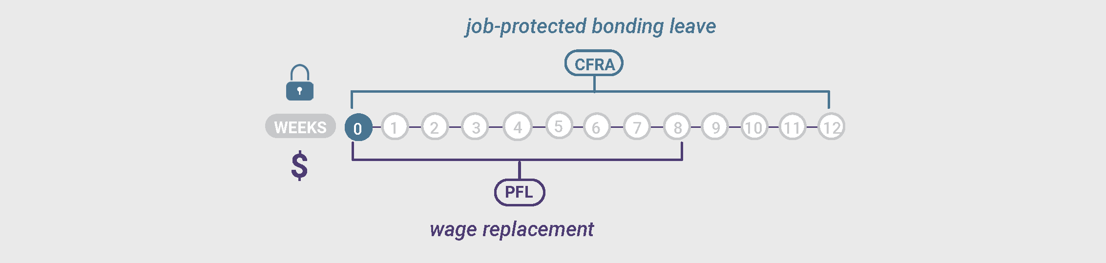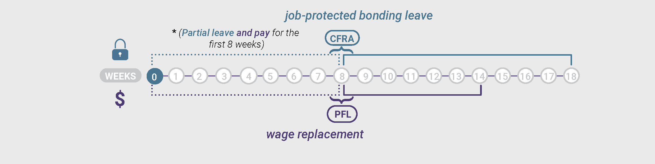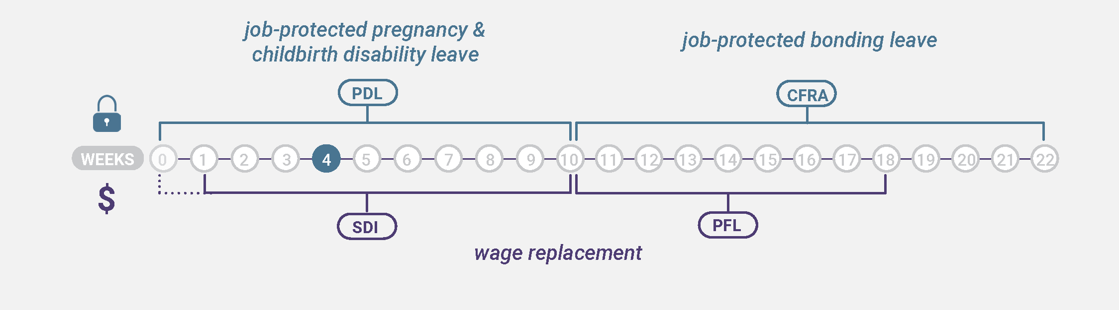 Pregnant Parent: Graciela’s baby is born 8 weeks premature while she is still working. Graciela is very stressed. Her doctor diagnoses her with postpartum depression. Graciela ends up needing 6 months off work for her health. To protect her job, she uses her 4 months of PDL. She still needs another 2 months of leave to recover, so she requests to use her CFRA leave for her own health for 9 weeks. Graciela is paid by SDI for the whole 6 months (after a 1-week unpaid waiting period). Because Graciela used 9 of her 12 weeks of CFRA leave for her own health, she only has 3 weeks of job-protected time off to bond with her baby after she has recovered. If she takes time off to bond, she can receive income through PFL for 8 weeks, but after the first 3 weeks, her employer will not be required to keep her job for her.
